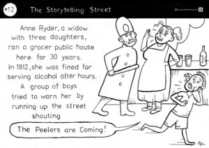 In 1912, Anne Ryder was charged with a breach of the licensing laws on a Sunday night. Sergeant Phalls deposed that at 7.30pm on Sunday a couple of boys ran past the and shouted “The peelers are coming!”. After a time, he entered the premises and found under the stairs a quart measure and two pint measures full of porter. Ryder said the liquor was ordered at ten to five but the judge didn’t believe her and issued a fine of 20 shillings plus costs.